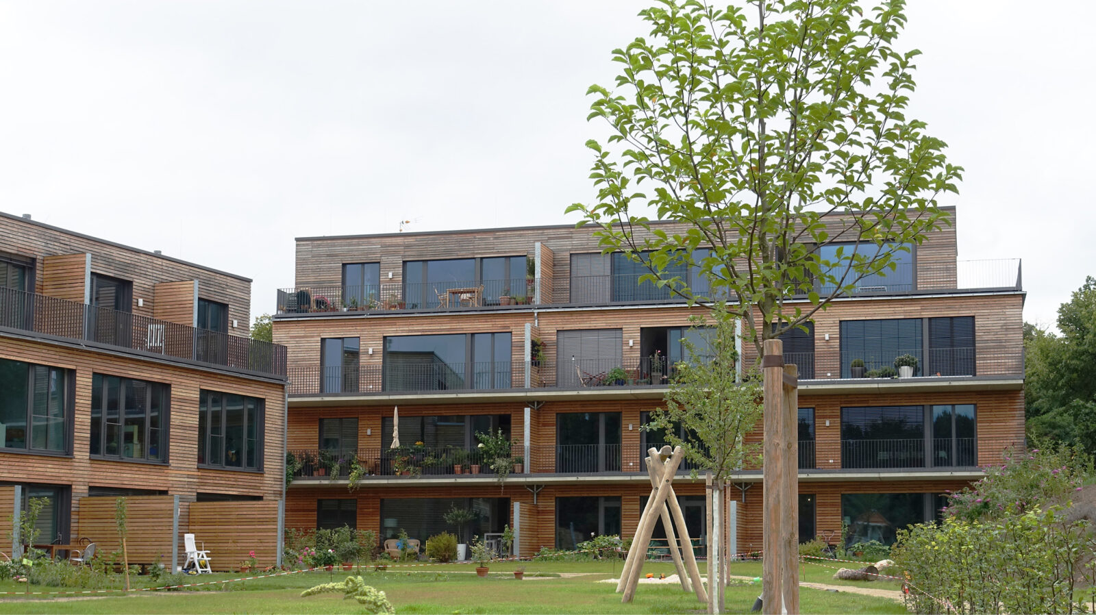 Die Gebäude werden so weit wie möglich aus vorgefertigten Holzbauteilen errichtet. Trennwände, Kerne und Geschossdecken im Wohnhaus werden konventionell in massiver Bauweise errichtet. Die Fassaden werden aus vorgefertigten Holzfertigteilen inkl. Wärmedämmung hergestellt (Holzrahmenbau) und vor Ort montiert und verkleidet, die Ausführung der Fenster erfolgt als Fenstertüren. Die Gestaltung der Fassaden erlaubt eine hohe Flexibilität für Trennwandanschlüsse. Alle Geschosse verfügen über französische Fenster zur Straßenseite, großzügiger Verglasung zum Garten hin sowie Terrassen/ Dachterrassen zum Gemeinschaftsgarten in Süd- bzw. Westausrichtung.