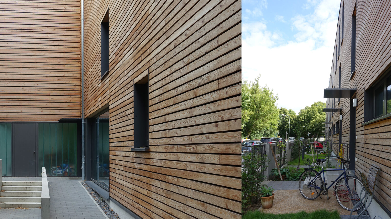 Die geschlossenen Teile der Fassaden werden aus wärmegedämmten Holzfertigelementen hergestellt, die Innenseitig eine Beplankung aus Gipsfaserplatten erhalten. Außenseitig erhalten die Fassadenflächen eine Bekleidung aus unbehandelten Lärchenholzlamellen. Lärchenholz, dass sich hervorragend für freie Bewetterung eignet, vergraut in einem über mehrere Jahre andauernden Prozess.