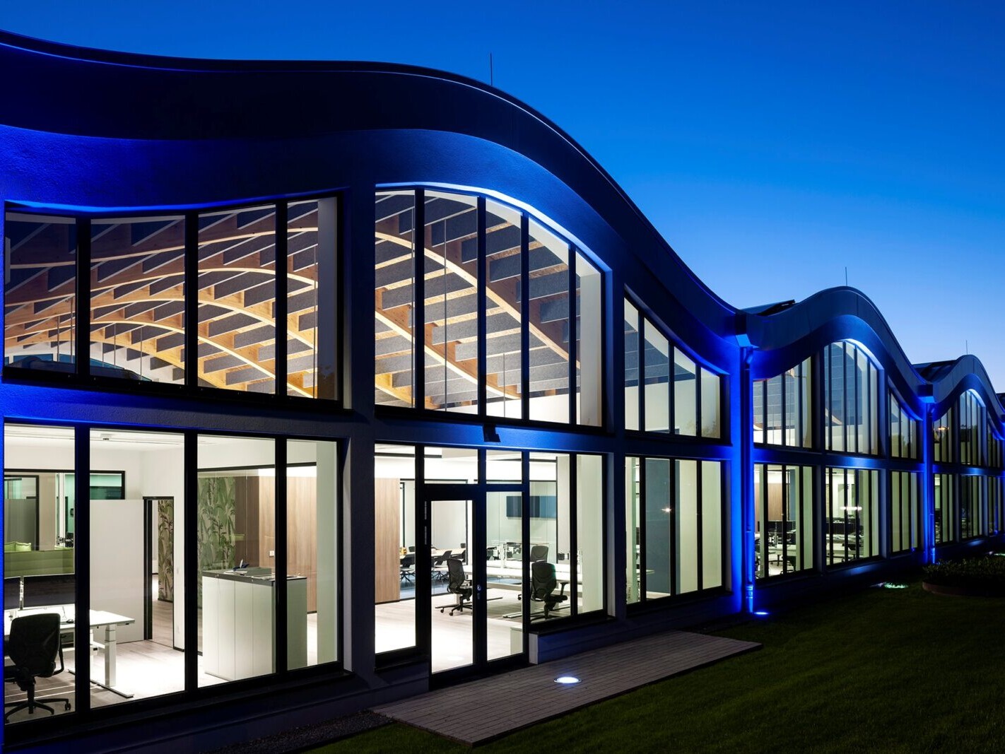Das charakteristische gewellte Dach ist auch Nachts, von innen beleuchtet, gut sichtbar © Heine Warnecke Design